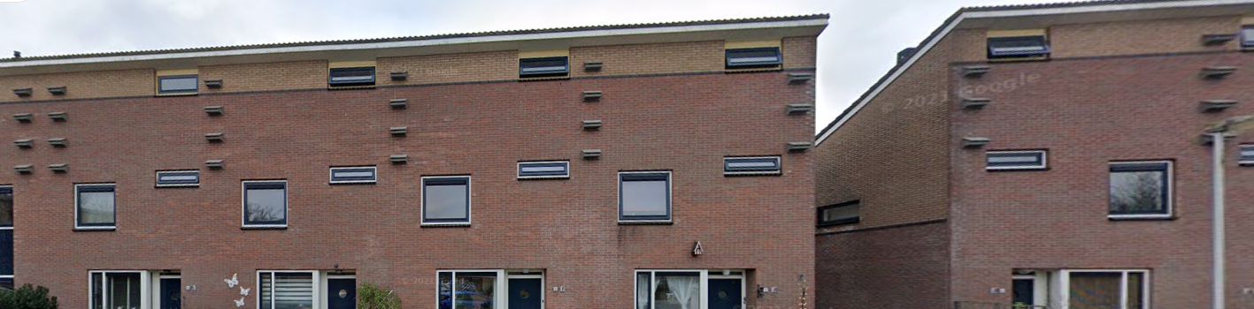 Rozenstraat 17-23, slooppand met 10 tijdelijke kasten ! In de wijk is al nieuwbouw uit een eerder project (voor mei '22) gerealiseerd met 20 tijdelijke kasten en 20 permanente neststenen, zoals Enkweg 16/24 (streetview juni '25).