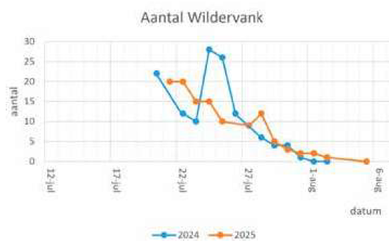 aanhoudend zomerweer. Op 5 augustus telden we er nog 25, op 6-8 nog maar 7, op 10-8 nog 4 en op 16-8 nog maar eentje. Onder de allerlaatsten zeer waarschijnlijk twee broedvogels van Dwerssteech 8