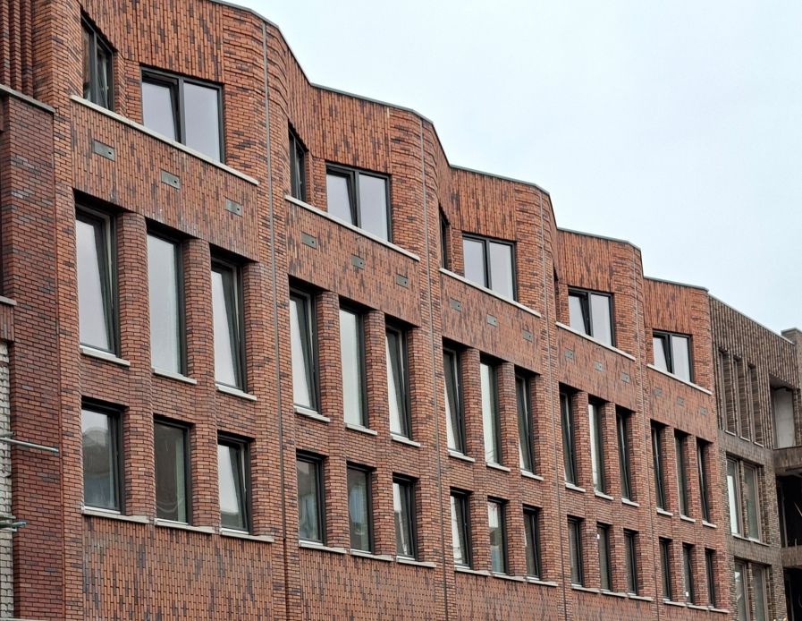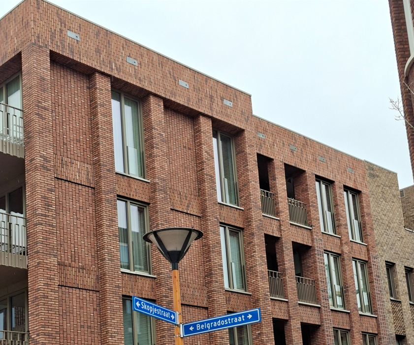 Gebouwd in '19-'20 maar pas ontdekt in juni '21. Twee bewoners meldden los van elkaar vogels, misschien gierzwaluwen, bij de kasten gezien te hebben. Spannend, dus gelijk maar kijken op de avond van 5 juli. Controle van bezetting is vrij makkelijk omdat vanaf het westen van het blok alle nestingangen in een blikveld overzien kunnen worden. Tussen 21.30 en 22.30 continue gekeken. Geen verzamelvluchten boven de wijk of het gebouw, geen giervluchten langs de gevels en geen in- of uitvliegende gierzwaluwen. De volgende dag bleken overdag wel een paar kasten bezet met jonge huismussen. In 2022 op 1 en 18 juli hetzelfde beeld, evenals bij de controles t/m 2025. Bij een stuk of zeven kasten is nestmateriaal in de opening te zien, waarschijnlijk een teken van huismussenbezetting.
