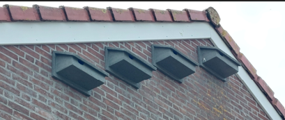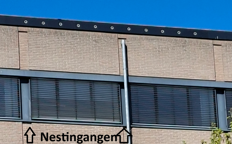 Hier en daar zit er ook een steen om de hoek onder de dakgoot (10 stuks, foto). Op G-streetview vond ik er 28 en later ter plaatse op 18-9-'25 ook maar 28. Niet goed gezocht! Adviseur Looplan meldde naar aanleiding van bovenstaande dat ze het project nog eens gecontroleerd hebben en illustreerde met foto's dat alle 40 neststenen ter plaatse zijn aan Landzicht en Reigersbos. In de ontheffing staat ook dat "de 'standaard'- en maatwerkmaatregelen jaarlijks worden geëvalueerd en zonodig aangepast aan de laatste onderzoeksgegevens", p.13. Ontheffing Wnb, 15 april 2020, p. 2, 13, 14