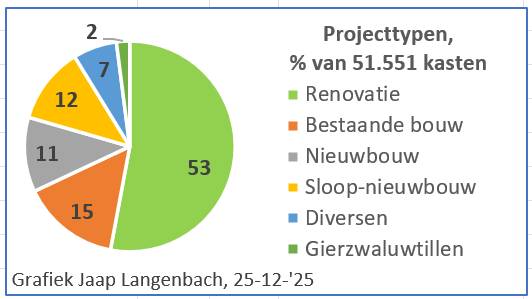 Oproep. Weet je meer? Kijk eens naar een project bij jou in de buurt en laat me weten wat je er nog meer van weet. "Zit er wat in ?" is vooral de vraag. jaaplangenbach@ziggo.nl 06 - 3849 7474. - Projecten met een * (>510 stuks) werden uitgevoerd volgens vergunning via de Omgevingswet (vanaf 1-1-2024, voorheen Flora- en Faunawet, Wet Natuurbescherming), een Soortenmanagementplan (SMP) of een gedragscode zoals NOM-keur. Een klein aantal anderen ook maar dat is dan niet bekend.