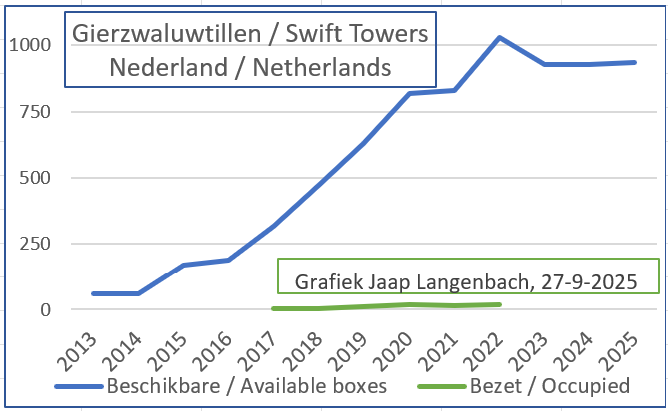 Aantal beschikbare gierzwaluwnestkasten in tillen / faunatorens en aantal bezette kasten.