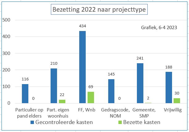Vooruitgang ? Uit aantallen bezette kasten en bezettingspercentages mogen geen conclusies worden getrokken over jaar-op-jaar 'voor- of achteruitgang'. De zoekinspanning loopt jaarlijks uiteen. Er komen jaarlijks nieuwe projecten bij die meestal pas na jaren (of helemaal niet) bezet raken. Ook worden nog steeds al langer bestaande projecten ontdekt. De bezettingshistorie daarvan is soms niet te achterhalen. Als het project in het ontdekkingsjaar niet bezet blijkt, wordt aangenomen dat het ook in de jaren daarvoor niet bezet was. Is het wel bezet dan worden de voorgaande jaren als "onbekend / niet gecontroleerd" genoteerd. In een paar gevallen (o.a. Rivierenwijk) is de eerdere bezetting geschat (rode jaarcijfers in de tabel). Door toegenomen ervaring, projectkennis en bijkomende informatie van derden is de vindkans van bezette kasten en betrouwbaarheid van de bezetting toegenomen. In de jaren voor 2023 zal de bezetting waarschijnlijk hoger zijn geweest.